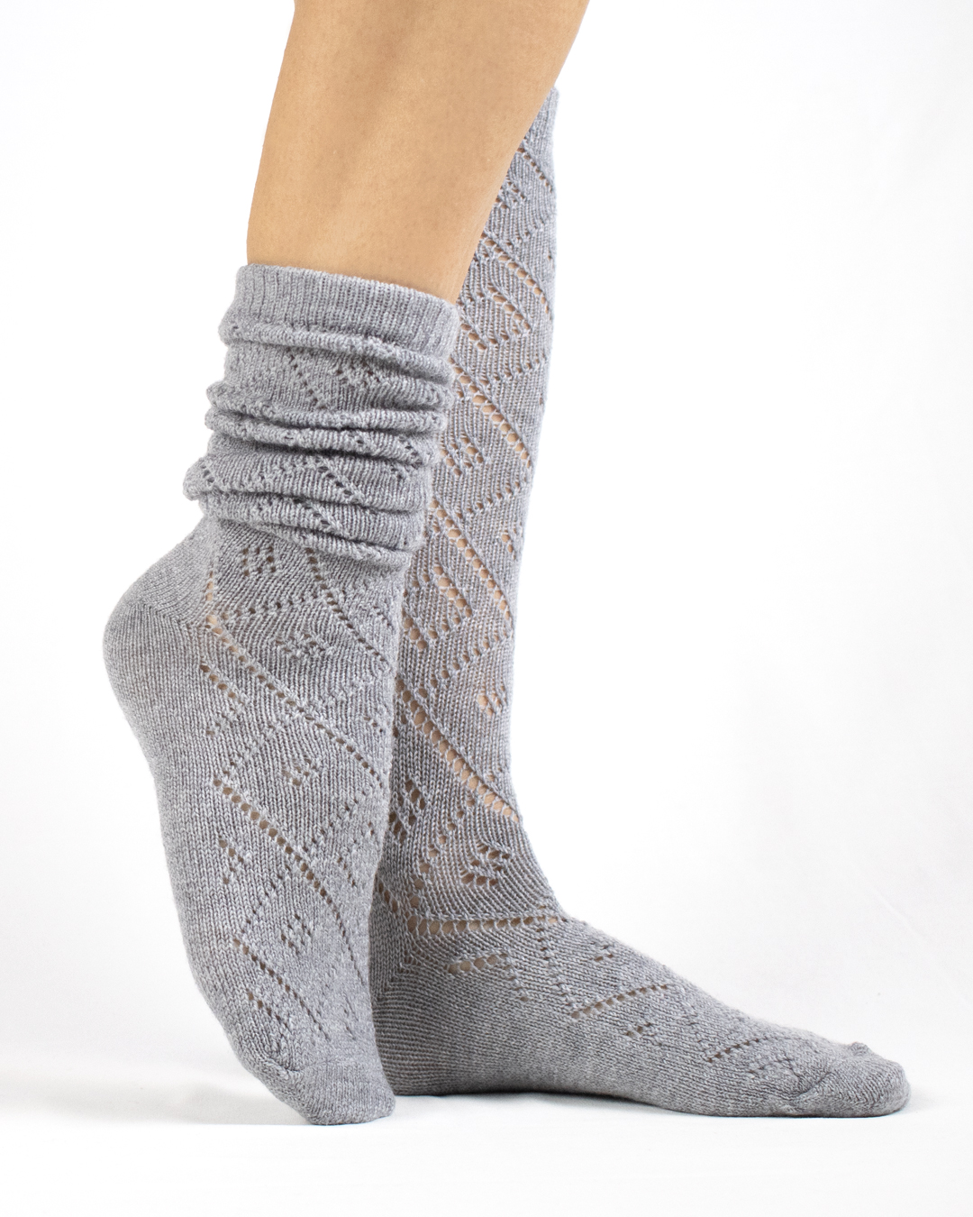 Le calze Ermione, gambaletto traforato con disegno a rombi, 100% Lana Merinos Extra Fine. Un classico che si rinnova, ispirato alle calze che hanno vestito generazioni di italiani, con la stessa poesia e delicatezza, reinventato con un tocco contemporaneo. Punta e tallone rinforzati con doppio filo per una durabilità superiore. Il polso elastico a costa sottile abbraccia delicatamente la gamba senza stringere, restando sempre in posizione. Perfetto con stivali e qualsiasi altra calzatura, per chi cerca piedi caldi, asciutti e un’eleganza che trascende le mode.